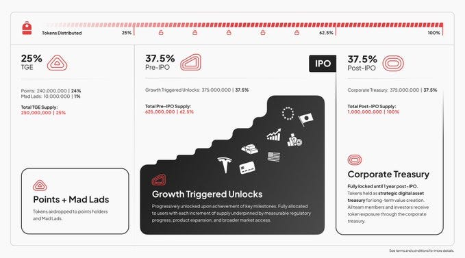 On the other side, liquid tokens go to users. Every major milestone such as new regions, new products, predictions, stocks, cards etc… acts as a growth lever. Tokens unlock predictably to active users, fueling expansion the same way points powered Seasons 1–4